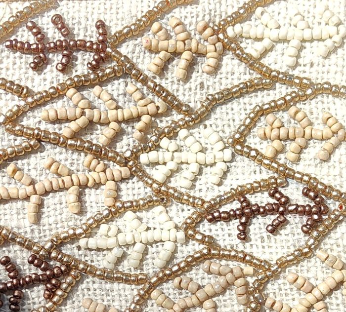 Dans le tissage serré et les perles fines, le doré se mêle aux tons crème et bruns comme un trésor patient. Chaque nuance capte un éclat de soleil, témoin de ce moment où l’énergie se concentre, se condense, et se prépare à nourrir l’intérieur.