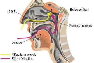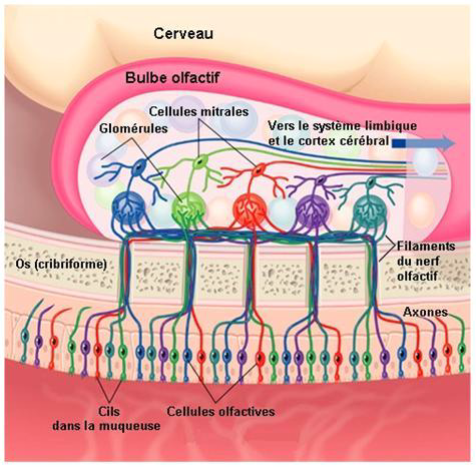 Coupe d’un crâne montrant les deux trajets de l’olfaction.