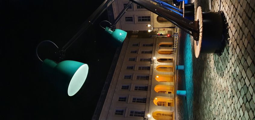 Il y a des soirs où la ville ressemble à une scène de théâtre. Le ciel est noir, la pierre est silencieuse, et pourtant… quelque chose éclaire. Dans l’une de mes photos, une immense lampe turquoise se penche sur une place pavée, comme si elle voulait prendre soin des passants. Une lumière simple, presque enfantine, mais incroyablement rassurante.