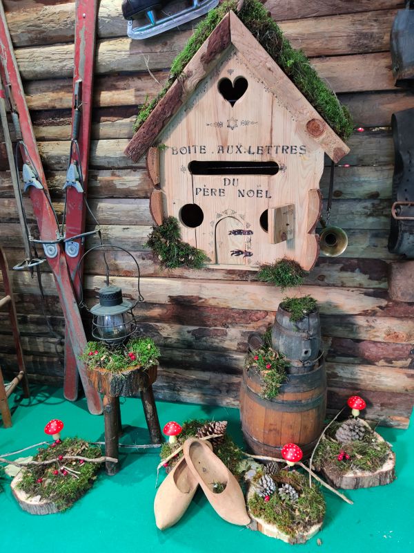 Dans une autre photo, il y a une scène rustique : du bois, de la mousse, des petits champignons rouges… et cette inscription : “boîte aux lettres du Père Noël”. Elle m’émeut, parce qu’elle parle d’un rituel simple : écrire. Déposer. Espérer.