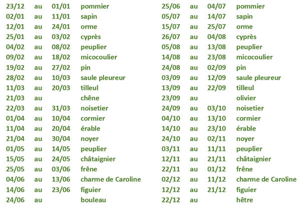 L’astrologie celte est basée sur la célébration de la nature et des saisons autour de 21 arbres qui gouvernent à tour de rôle des périodes de quinze jours. En fonction d’un calendrier précis, lié à une période calculée en fonction du calendrier lunaire, chacun peut y découvrir son « arbre totem ».
