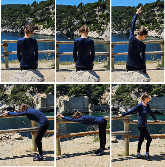 Inclinaison de la tête, étirement du buste latéralement avec un bras, arrondir le dos, allonger le dos, ouverture de l'épaule.