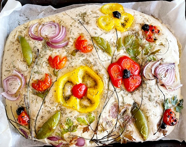 5 Préchauffez votre four à 180 °C et dès qu'il est chaud effectuer des trous avec les doigts sur le dessus de la pâte et déposez le reste d'huile d'olive à l’intérieur. Décorez avec les légumes ou herbes aromatiques qui amèneront votre touche poétique. Enfournez pour 20 min environ.